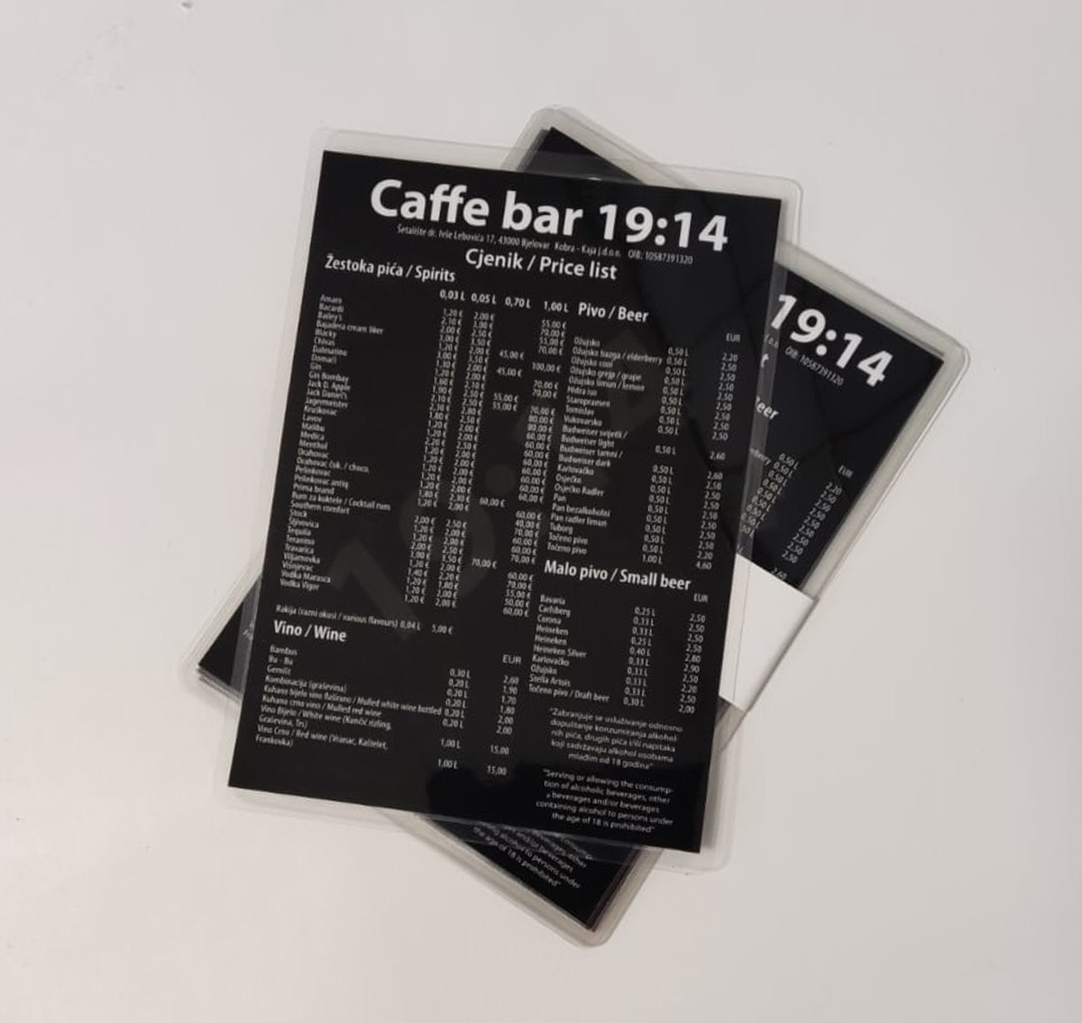 Koristimo visokokvalitetni tisak i dizajn prilagođen vašem brendu, čime svaki cjenik postaje jasan, pregledan i estetski privlačan. Po želji izrađujemo i menije i druge srodne materijale, koji zajedno stvaraju prepoznatljiv vizualni identitet Vašeg poslovanja.